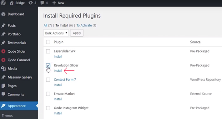 In the list of plugins, check the box next to Slider Revolution and click the Install button.
