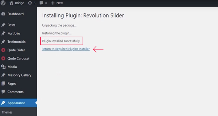 Once the plugin has been installed, you will see a notification that says Plugin installed successfully. It’s time to return to the required plugins installer.