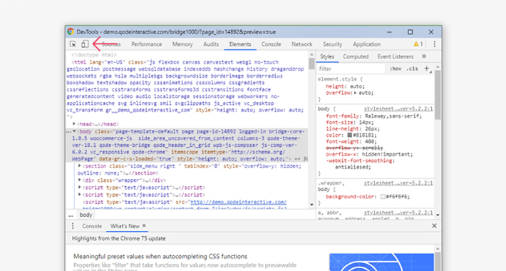 To activate the device mode, simply press F12 while in Google Chrome and then click on the icon shown below: