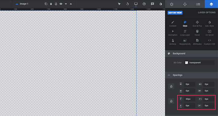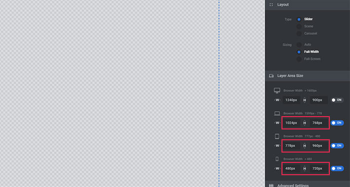 Let’s assume that you are working with a Full Screen slider. Your slider background is always going to take up the entire visible space on the screen, no matter what you enter in the fields above. However, these fields will limit the size of the grid in which your layers will be shown. They ensure you have a margin between the edge of the screen and any elements of your slider which are not the actual background image.