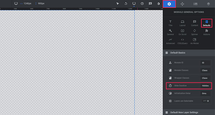 Under Module General Options > Defaults, you will see that the default slide duration is set to 9000ms. That means that every single slide in your slider will last 9 seconds before switching to the next slide. I personally think that’s too much, and that the slide duration should not be over 4000ms. Otherwise, your users will most likely only see your first slide. I mean, come on, who’s going to wait 9 seconds for a slide change?