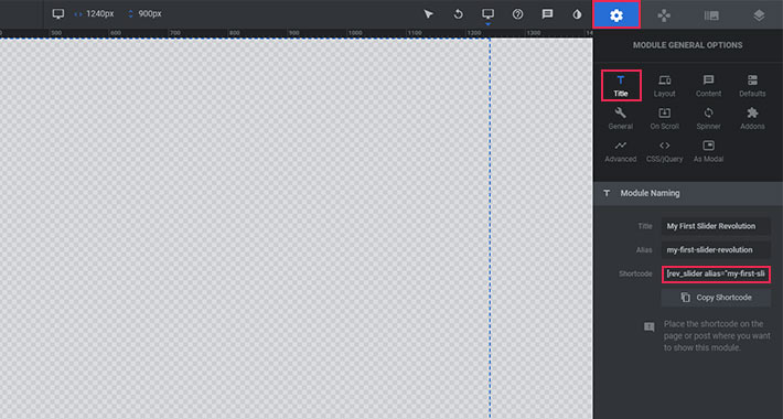Now it’s time to decide where you want to display your slider. To add a slider to a page, you first need to copy the slider shortcode from Module General Options > Title. In our case, the shortcode is [rev_slider alias=”my-first-slider-revolution”].
