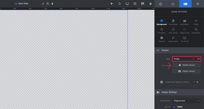 To add a background image, all you need to do is select Image from the dropdown, and then click the Media Library button. Now you can either upload a new image or choose one from your Media Library. Just make sure to choose an image that corresponds to the size of your slider. I’ve created a Fullscreen Slider, so the size of my image will be (at least) 1920×1100 pixels in order to fill the entire space of a desktop screen.