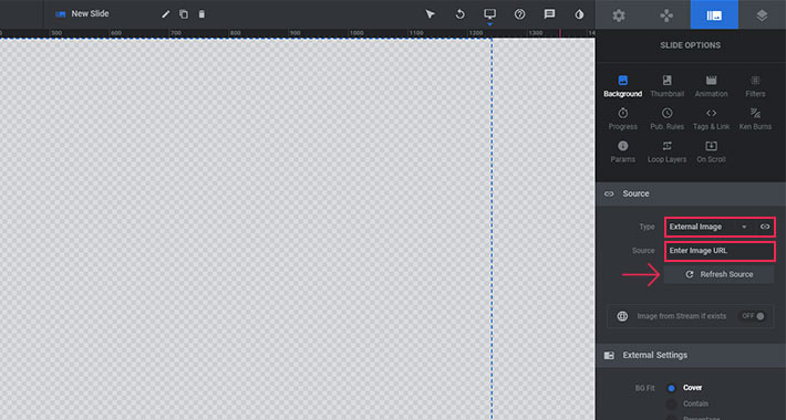 You can also add an image from an external source by choosing External Image from the dropdown. You should enter the image URL and click the Refresh Source button.