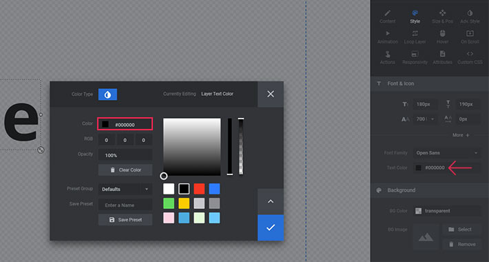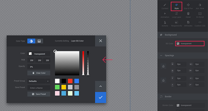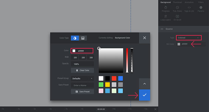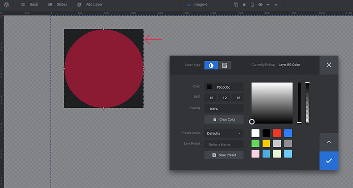 If your slider design requires a color for the background instead of an image, you can set that up pretty easily. Just select the Colored option from the Type dropdown in the Source panel, and then click the BG Color button to choose your color. You can choose the color using the color picker tool, or you can simply input the hex value into the Color Hex Value field. You can also play around with the opacity if you like. Setting Opacity to 100% will give you a fully saturated color, while lower values will result in a semi-transparent background. Once you’re done, just hit the blue check mark.