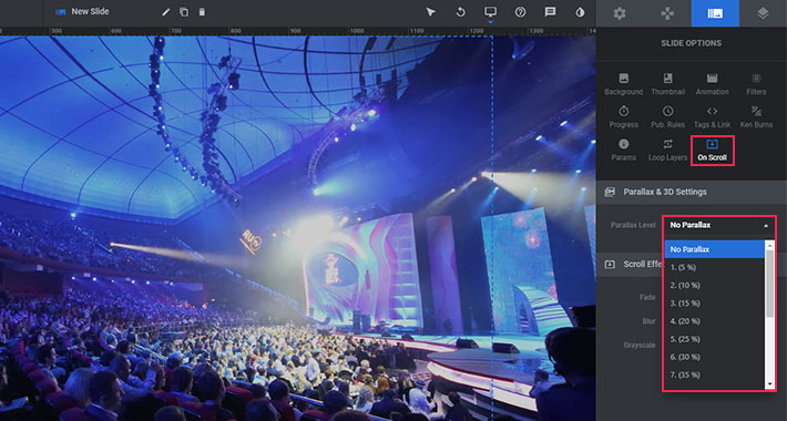 Under On Scroll > Parallax & 3D Settings you can customize the parallax effect for each slide. Just make sure Parallax is enabled in your Module General Options.