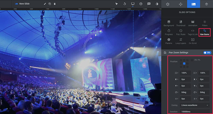 If you’d like your background image to zoom in or out, the experts from Slider Revolution have made the Ken Burns effect, which you can turn on and customize in the dedicated Ken Burns panel.
