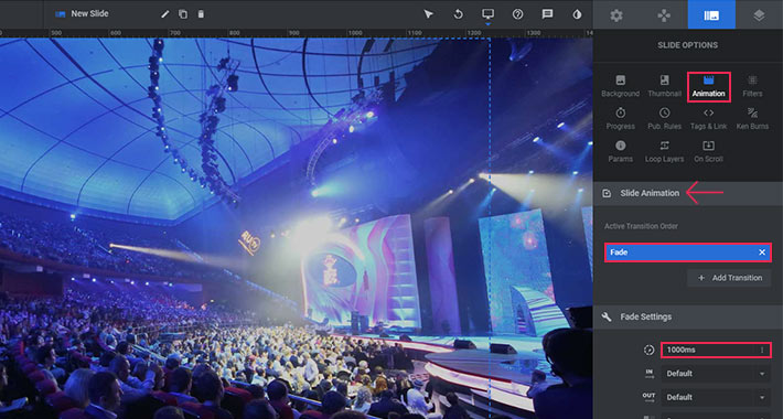 You can change the way your slide enters the screen under the Slide Options > Animation > Slide Animation tab. The default animation is Fade. If you leave the default Fade option, your slider background will simply fade in. Here, you will also find a field for configuring the animation duration, which is set to 1000ms by default.