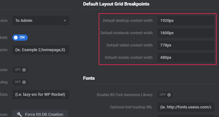 Now, instead of the auto sizes, you will see grid sizes from the global settings displayed for each separate device. The grid is the area in which your slider layers (text, buttons, etc.) will be displayed. The first field shows the width of the grid (which you already defined in your Global Settings), and the second shows the height.