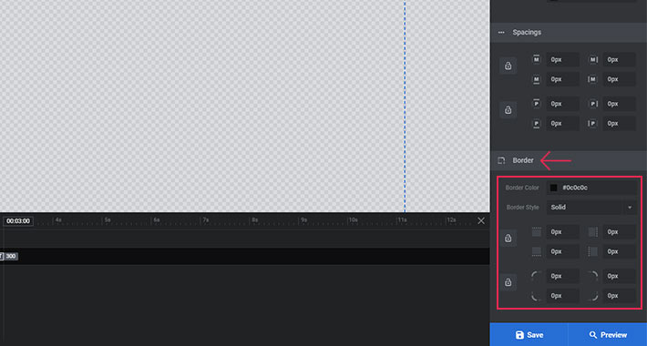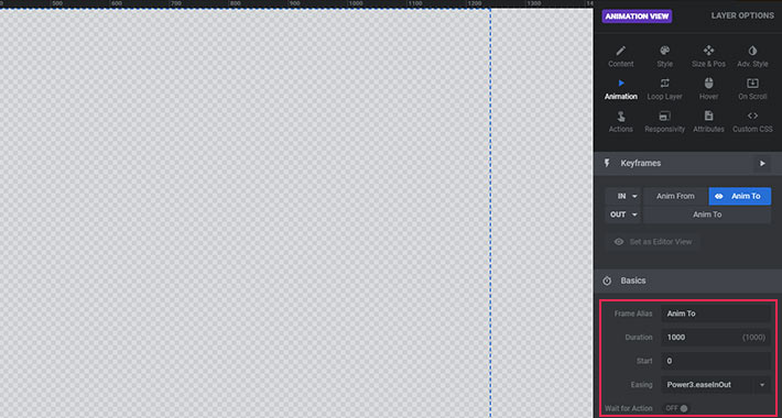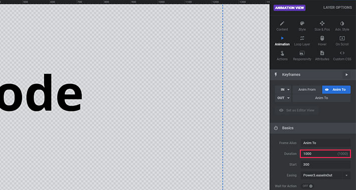 You’ll see that the default frame start value for each layer is set to 0 milliseconds. This means that each layer will appear onscreen 0 milliseconds after your page loads. The default appearing duration is 300ms, which means that it will take the layer 300ms (or 3 seconds) to go from invisible to fully visible. To change these default options, choose the layer you want to edit and simply insert a different value.