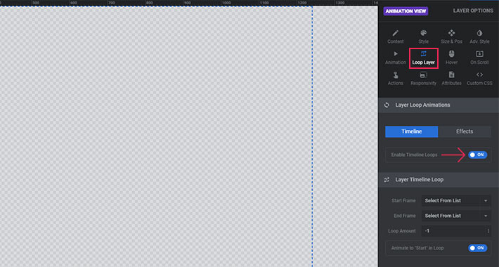 Slider Revolution also lets you create Loop animations. This is done in the Loop Layer tab. Here, you will see that Loop Effects are disabled by default.