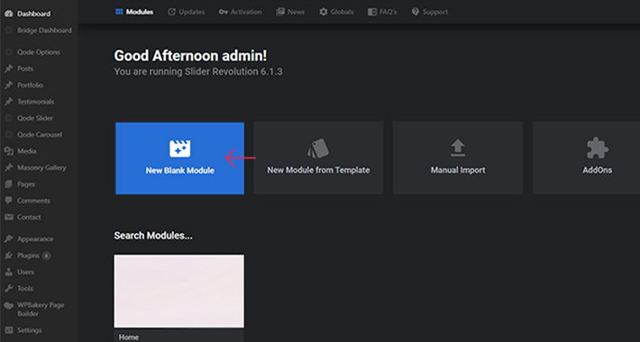 Now that we’ve configured the global responsiveness settings, we’re ready to create our first slider. Navigate to the Slider Revolution tab, and click on New Blank Module: