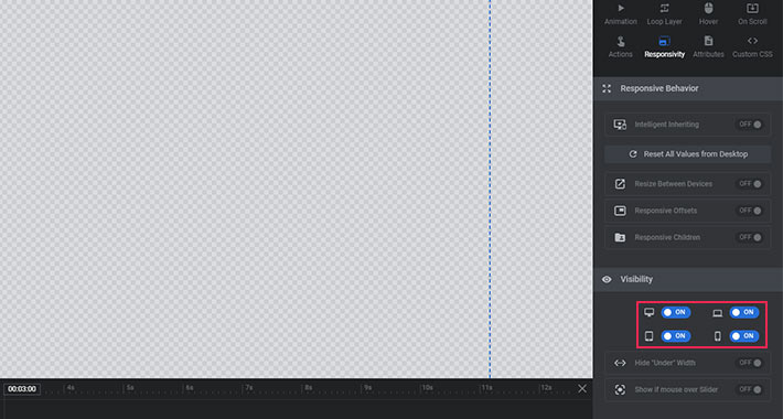 If you want your layer to be visible on all devices, then make sure the switches shown in the image below are all turned ON. The first one is for desktop, the second one is for laptops and horizontally oriented tablets, the third one is for vertically oriented tablets, and the last one is for mobile phones. If, for some reason, you want to hide your layer on any device, simply turn off the appropriate switch.