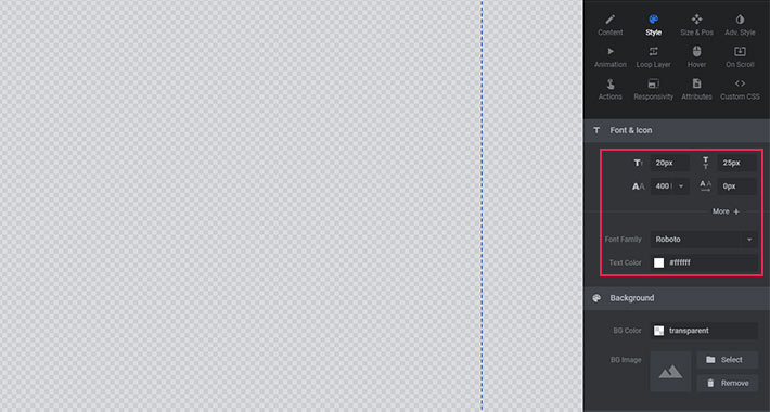 Now take a look at the Style tab. You can see that Roboto is the default font family for every text layer you add. You can choose your preferred font from the dropdown. Just a quick reminder – in order to edit the text layer, you first need to make sure it’s selected.