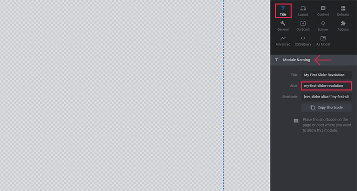 Now that you’re in the workframe, the first thing you should do is give your slider a name. Look for the Module Naming section on the right (under the Title tab). We’ll name our first slider ‘My First Slider Revolution’ – that’s what you need to enter in the Title field. The field below it is reserved for the ‘Slider Alias’. The name of the slider should also go here, only in lowercase and with dashes between the words instead of spaces. You will later use this Slider Alias to add your slider to a page on your website.