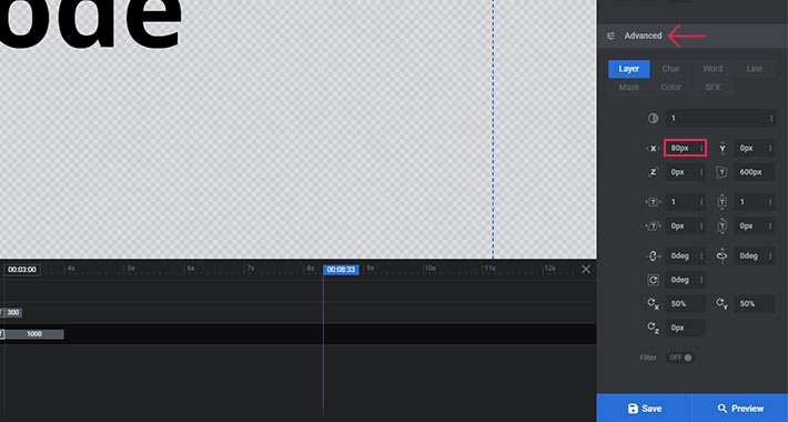 If you want to customize the default animation presets, you can check out the Advanced section settings below. So, for example, if you think the starting point for the Short-From-Left animation is too short, you can easily change it. Let’s say we want it to start 80px further to the right: all we need to do is input 80px into the X axis field.