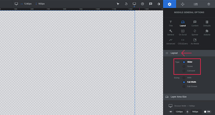There are three types under the Layout tab – Slider, Scene and Carousel.