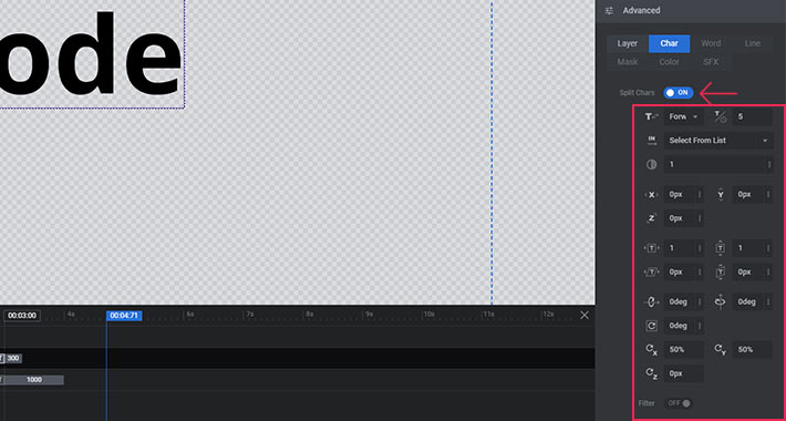These are useful only for text layers. You can use the Char, Word, and Line tabs to split the animation applied to your text by letter, word, or line.