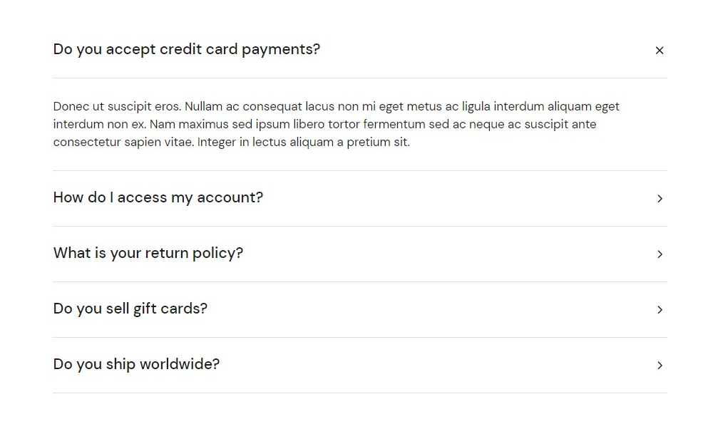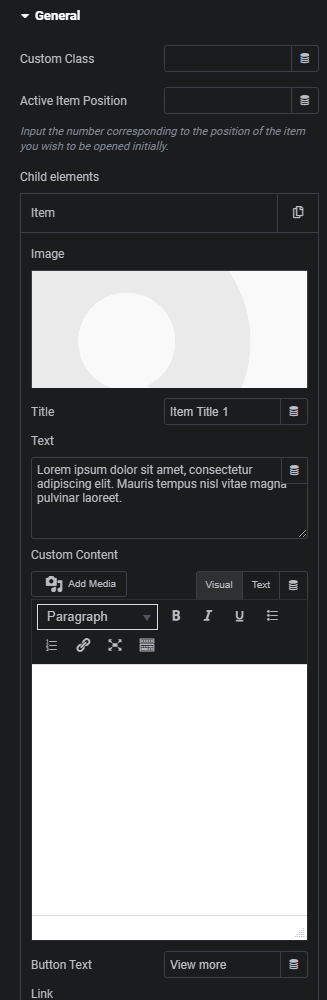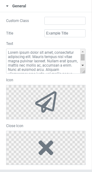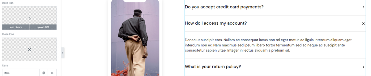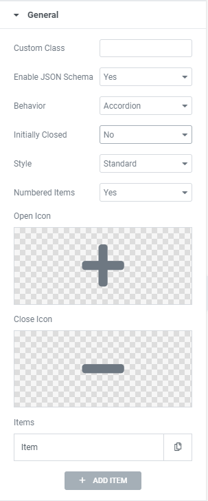 The Open Icon and Close Icon fields let you pick an icon or an SVG you wish to display in the element. Depending on the state of the section (active or passive), these icons will be displayed on them – close icon for already expanded sections and closed sections on mouse hover, and the open icon for all passive/closed sections.