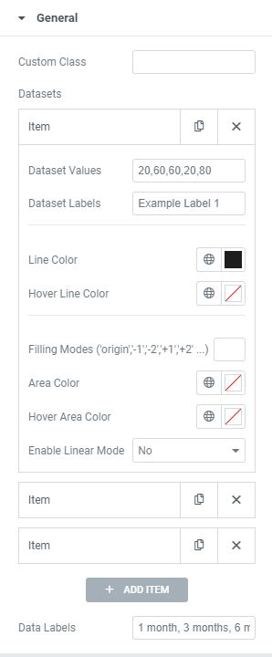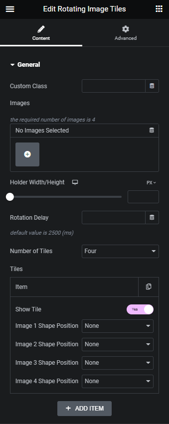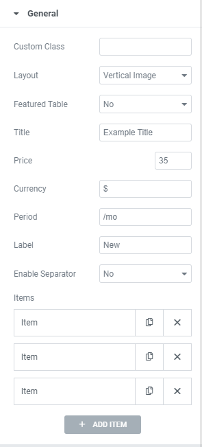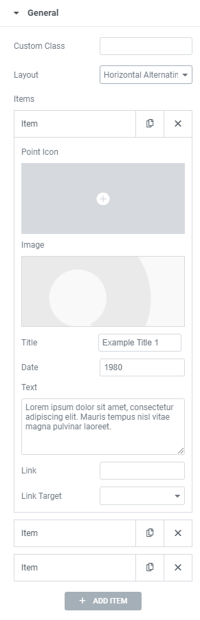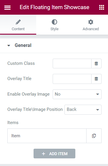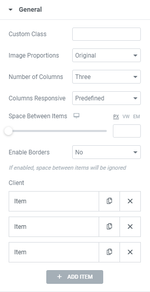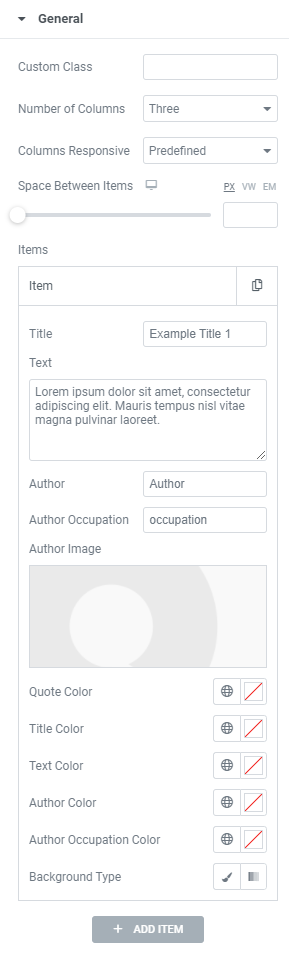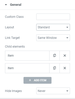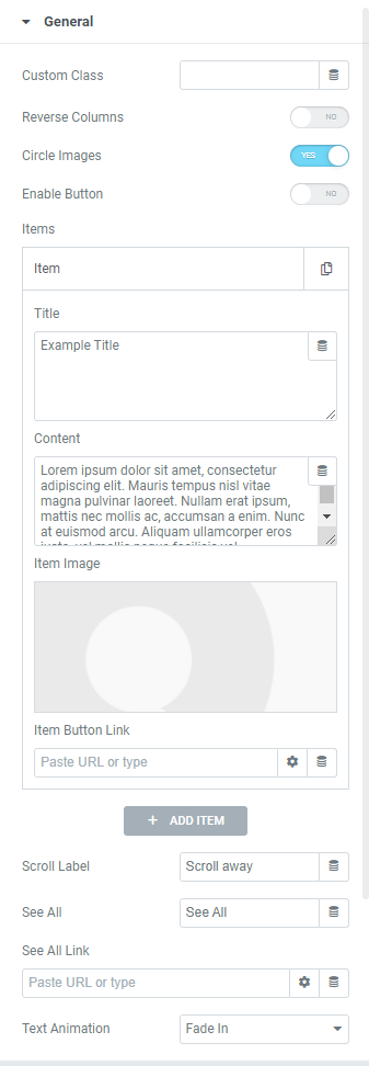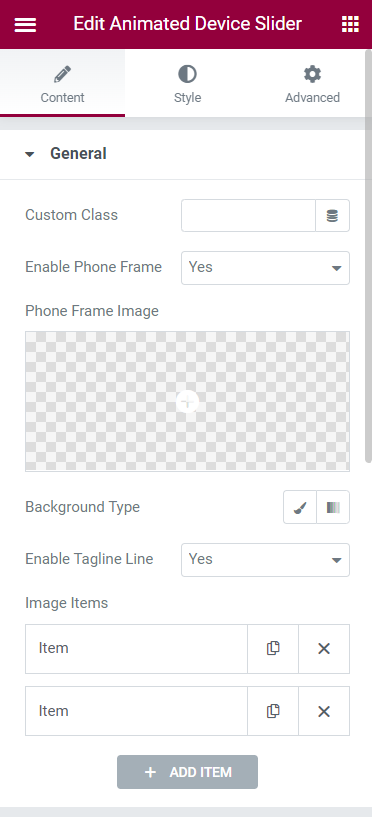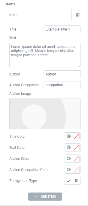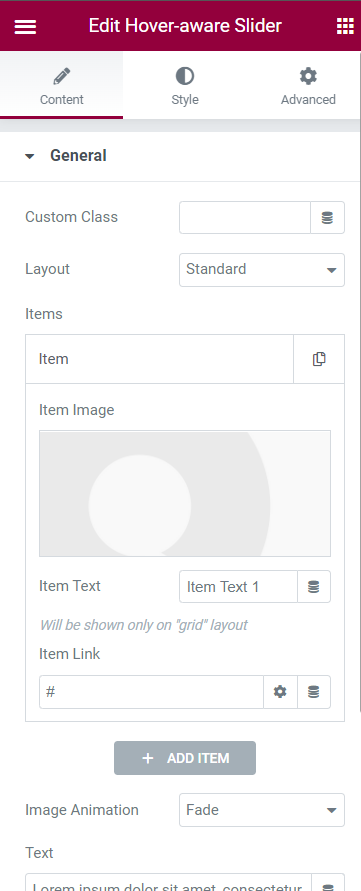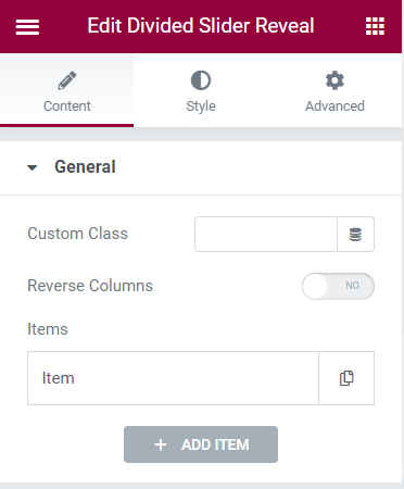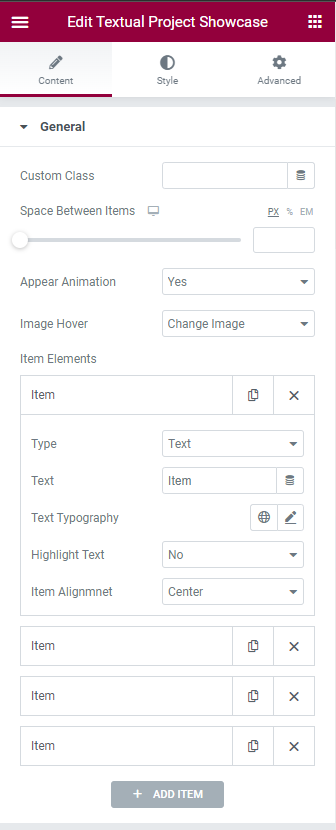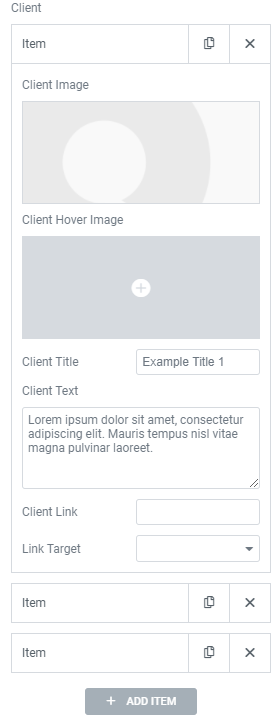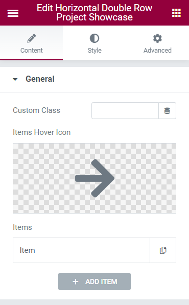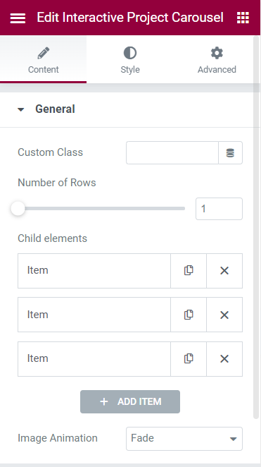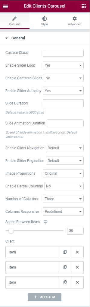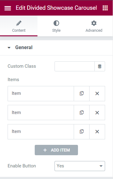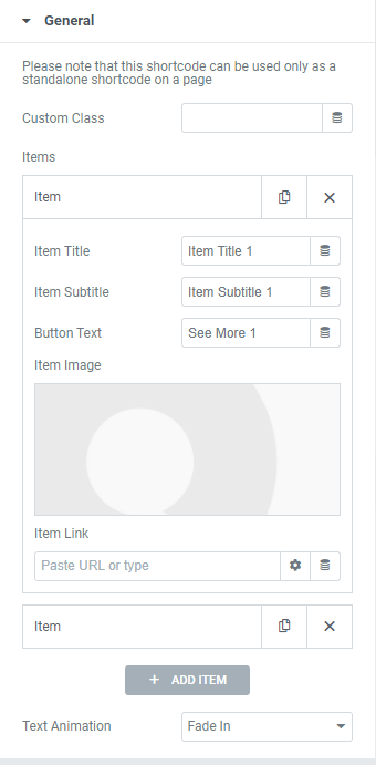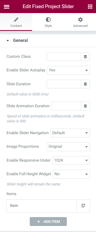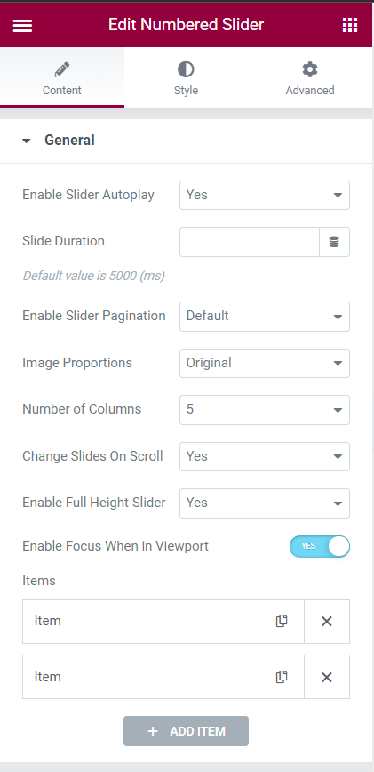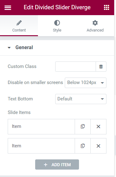 This is where you can add the individual items or slides you wish to showcase inside the element. To perform this, simply edit one of the existing items or click the + Add Item button to add a new slider item.