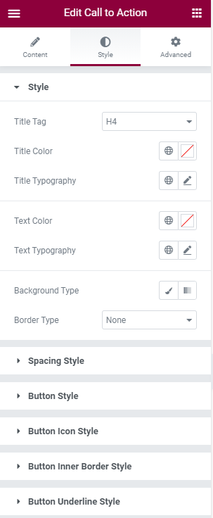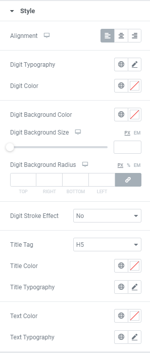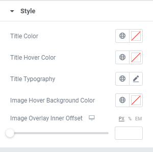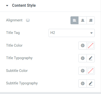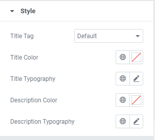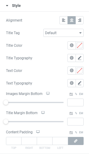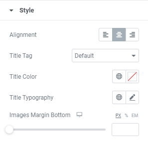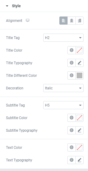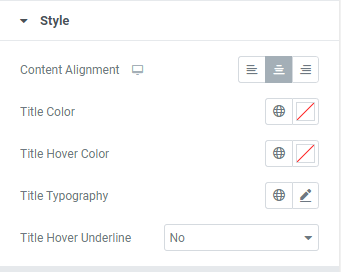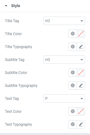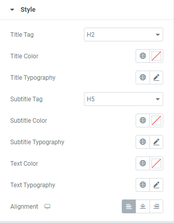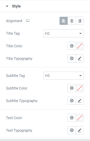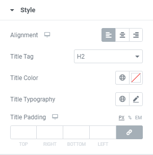 In the style sub-tab you can choose an alignment for the element, set a heading tag, color, typography, and input padding values for the title.