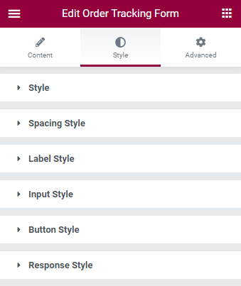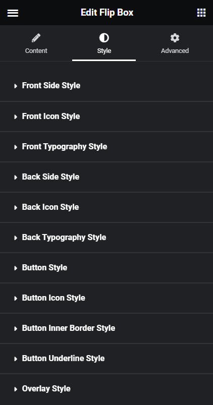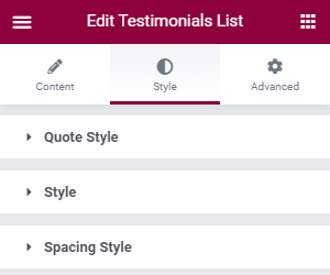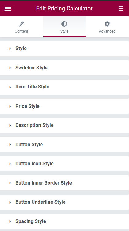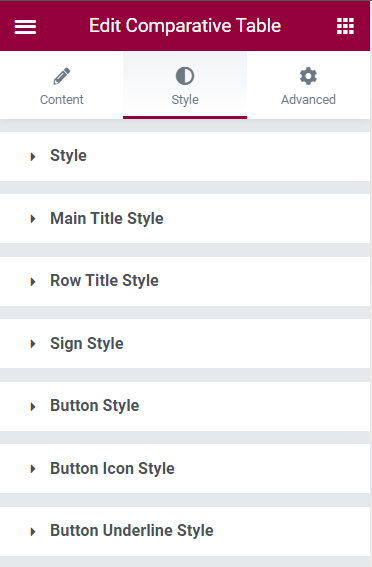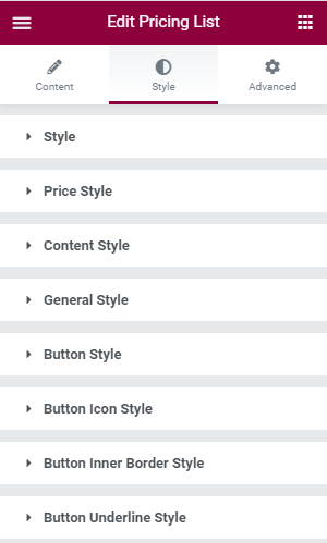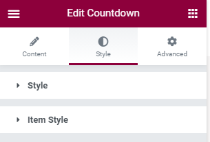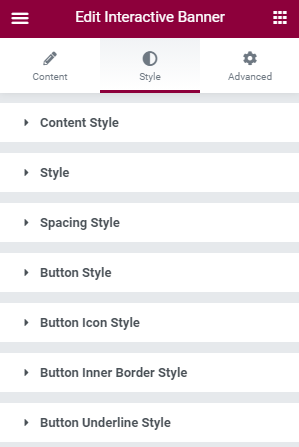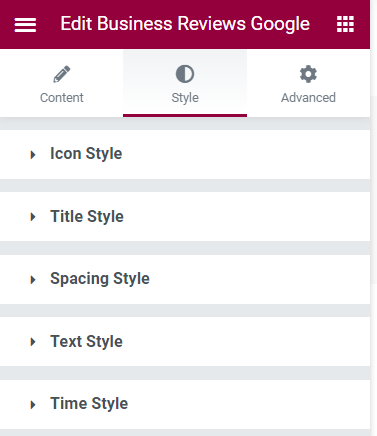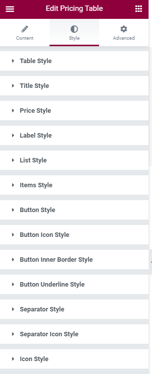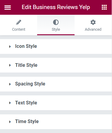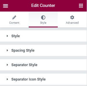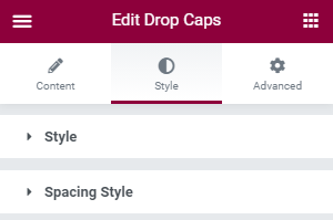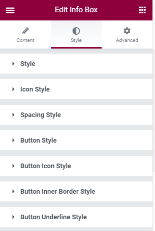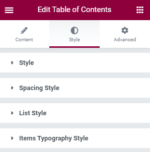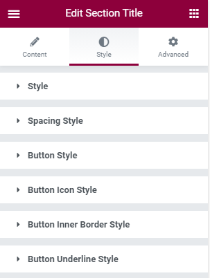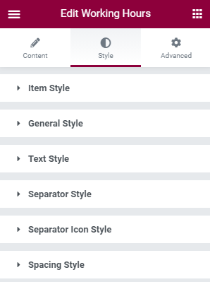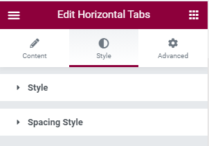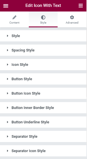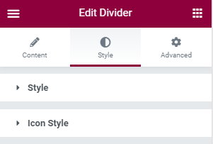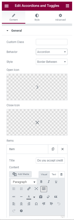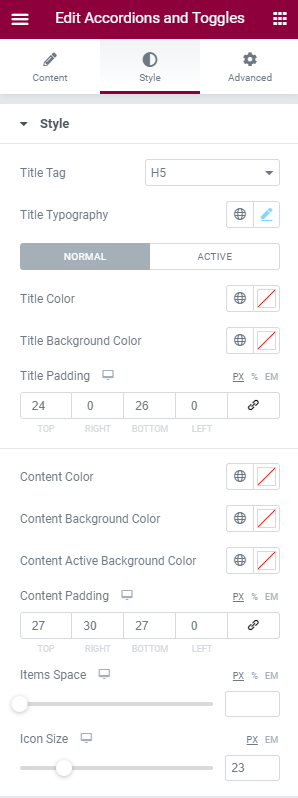After you have picked a behavior type, style, set up the open & close icons and added individual items for sections, you can move on to styling the element. To access these settings, simply click on the tab titled Style, located next to the Content tab in the upper-left side of the screen.