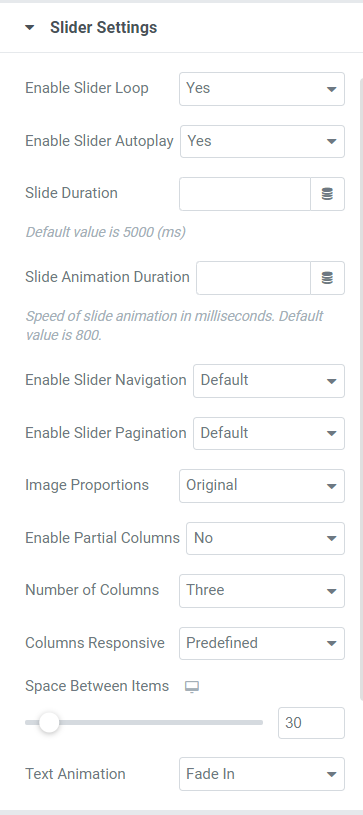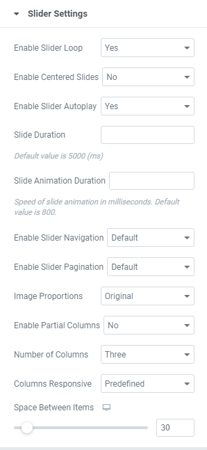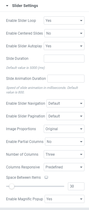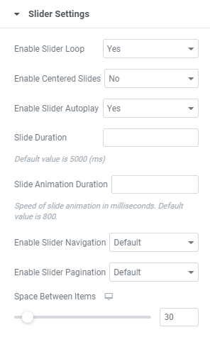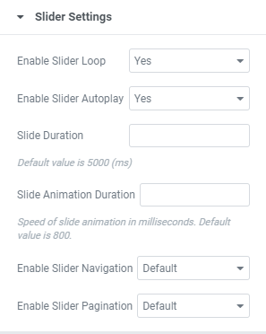 Here you can enable slider loop if you would like the slider to start over from the first image when it comes to the end of the list, enable automated slider play, and input a value for the slide duration and the slide animation duration.