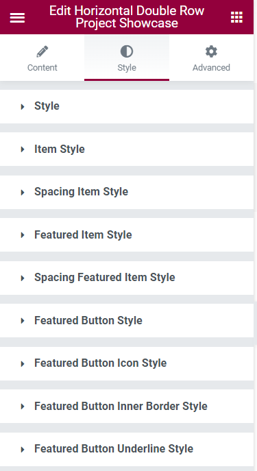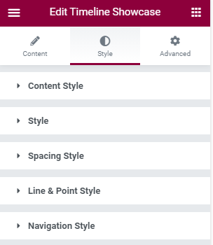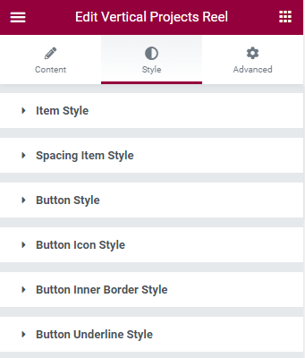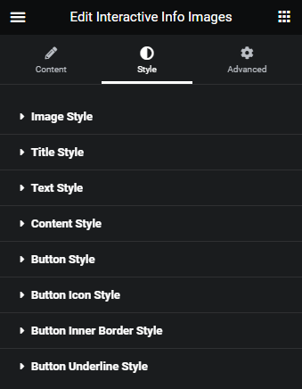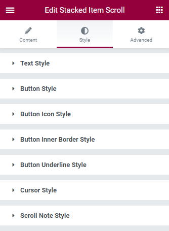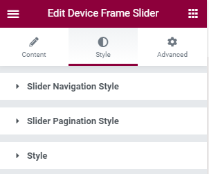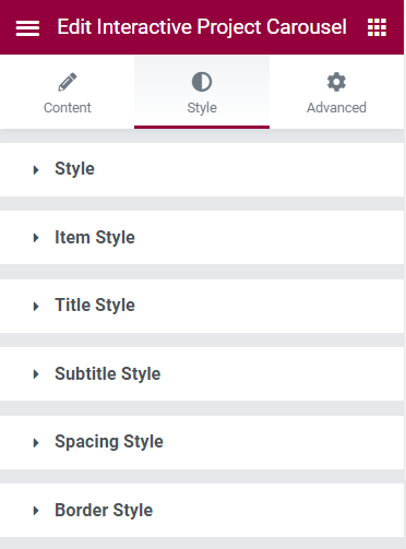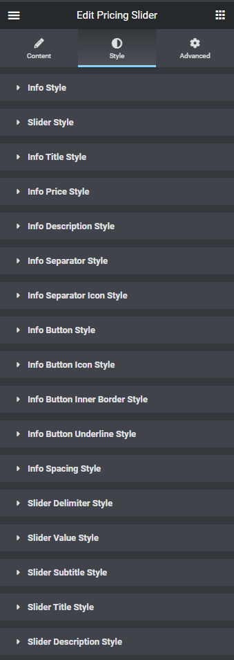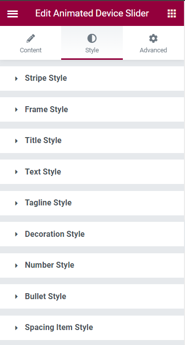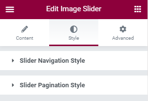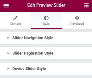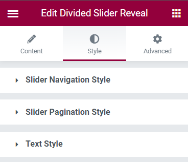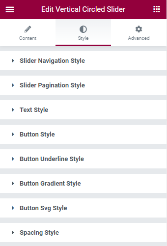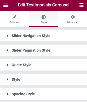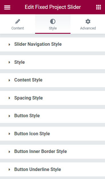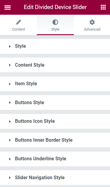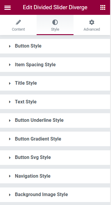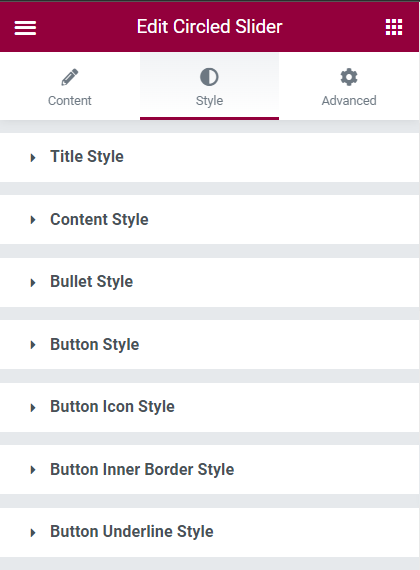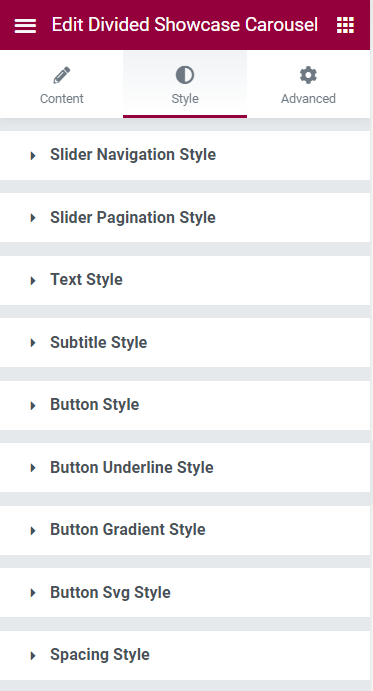 After you have finished with the basic set up of your content slider, you can move on to styling the element. To access these settings, simply click on the tab titled Style, located next to the Content tab in the upper-left side of the screen. Here you'll find 11 sub-tabs for styling different aspects of the element.