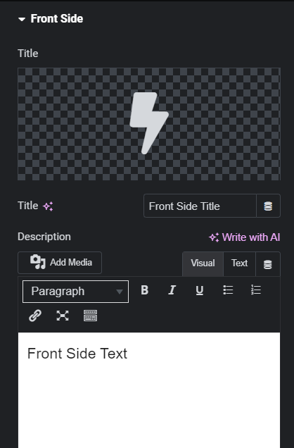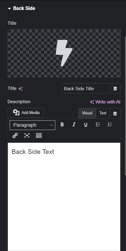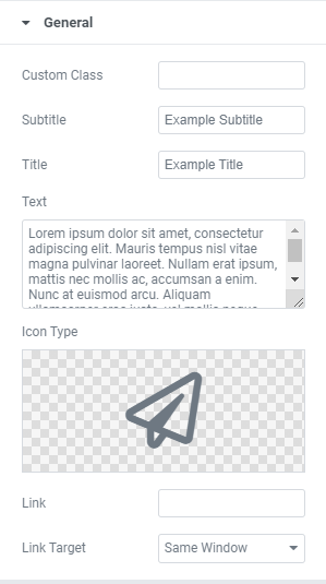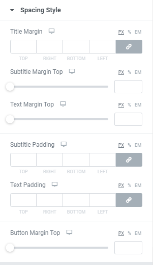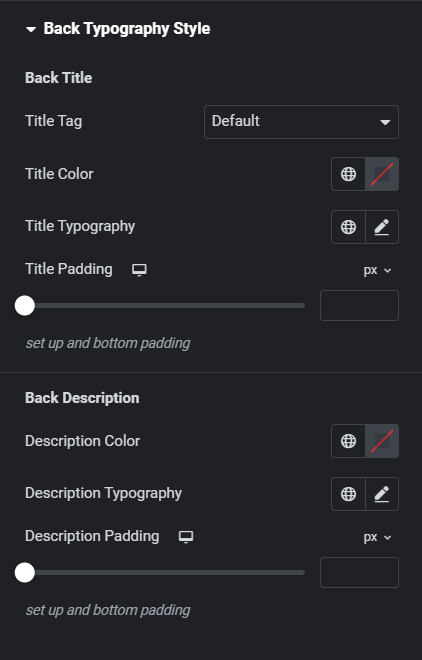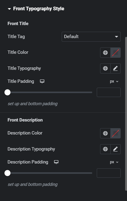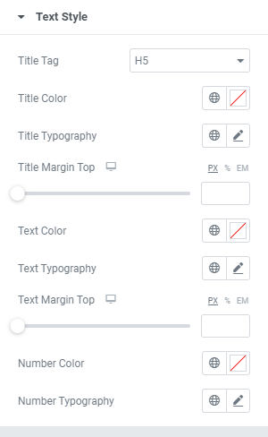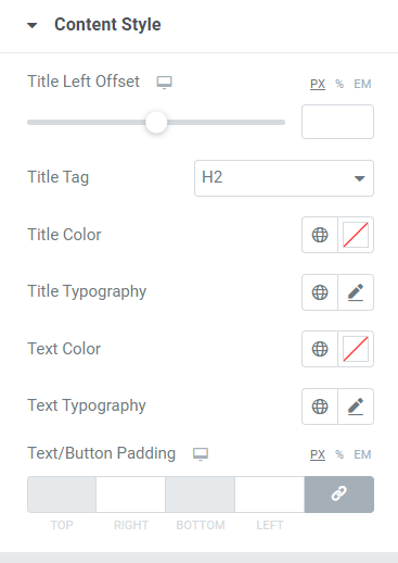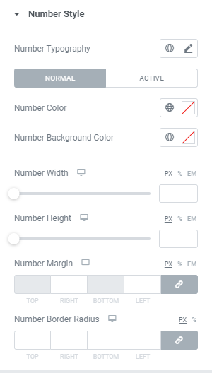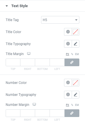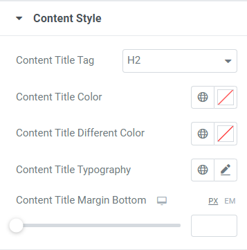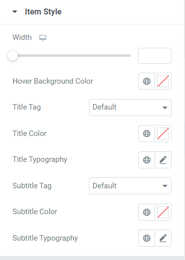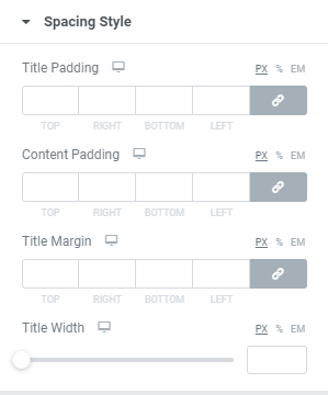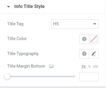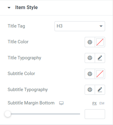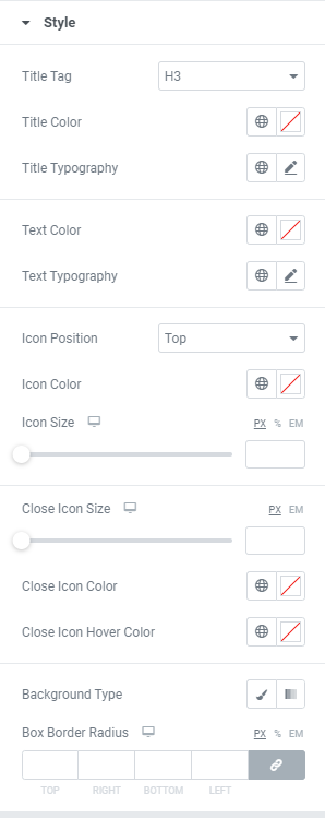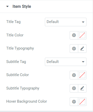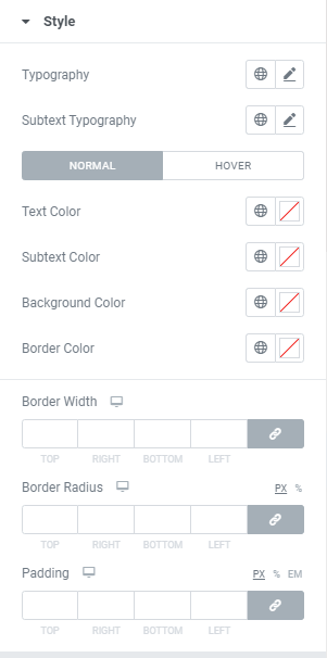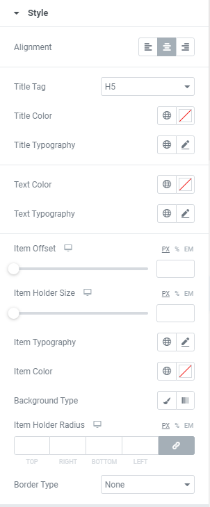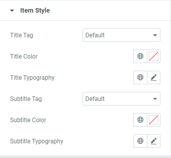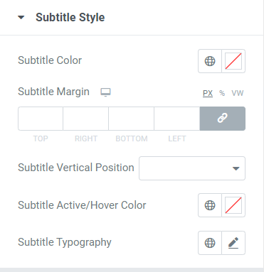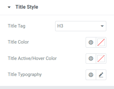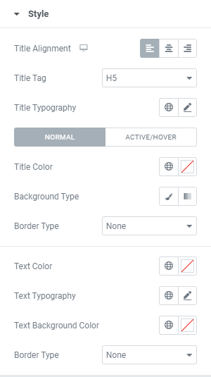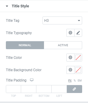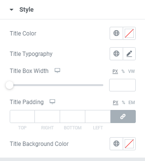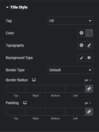In this sub-tab you get presented with options relating to the title; here you can set a heading tag for the element title, adjust title color, typography, background type, border type, border radius, as well as input padding values for the title.