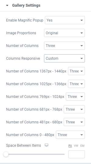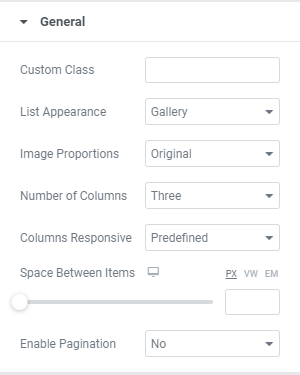 You can also set proportions for the image, pick a number of columns you wish the list to have and choose between predefined responsive settings and inputting different column values for different responsive stages yourself. The last two options let you choose a size for the space between list items and choose whether you wish to display pagination bullets in your list.