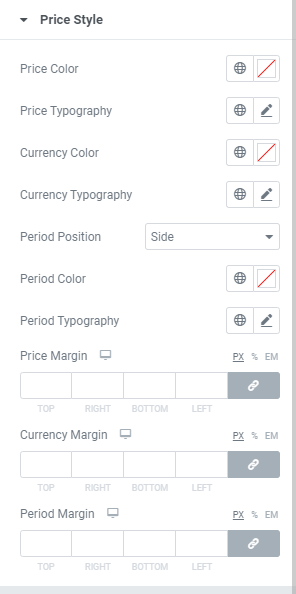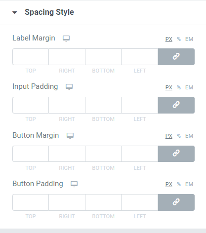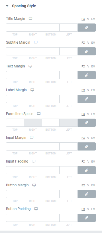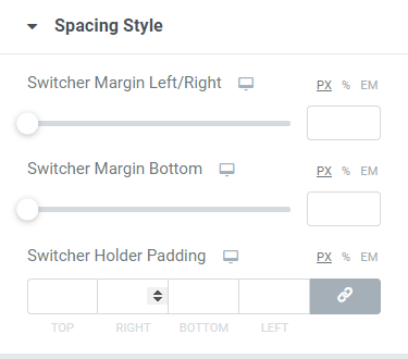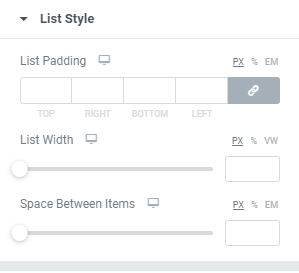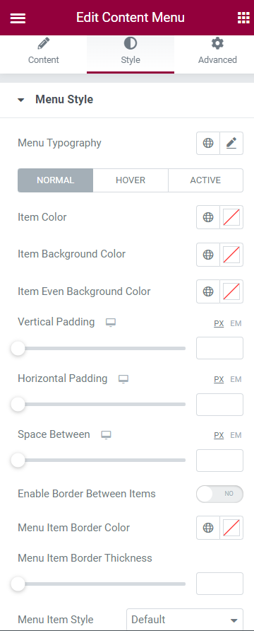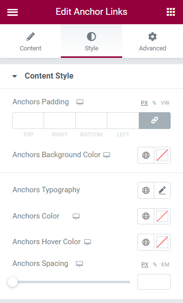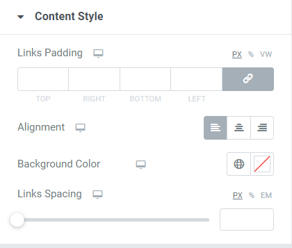 This is where you can input padding values for the links, set element alignment, background color and adjust the size for the space between links.