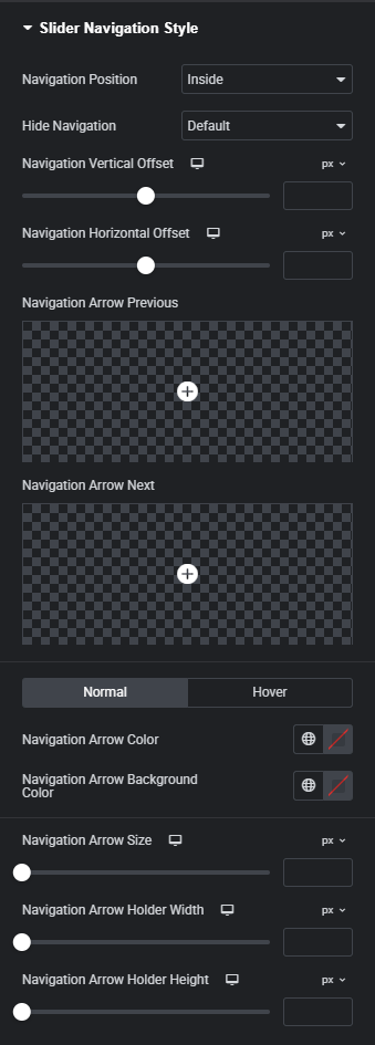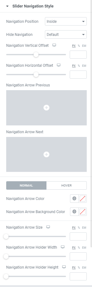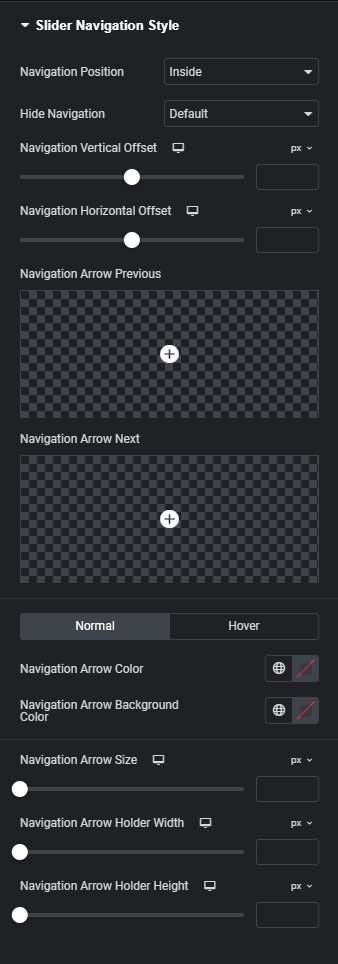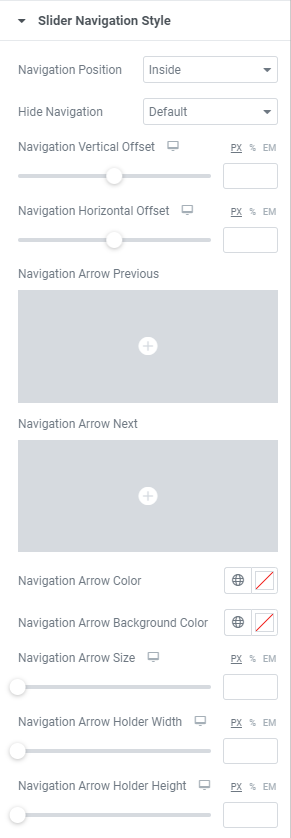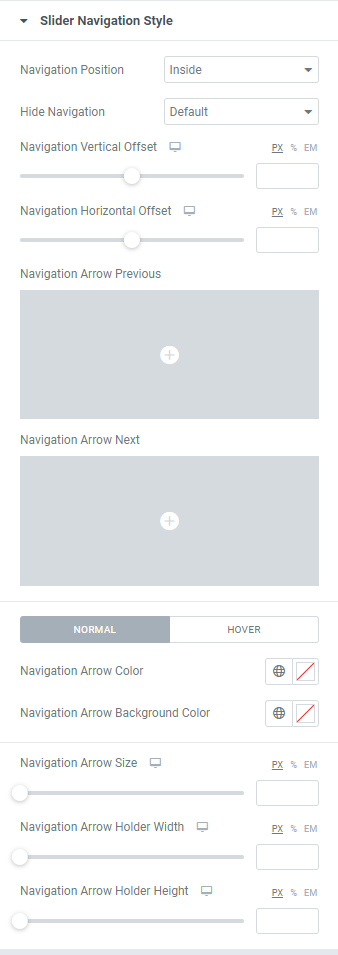 Here you can choose where you wish to place the navigation relative to the slider, pick a resolution below which the navigation arrows are hidden, and set a vertical and horizontal offset for the navigation arrows.