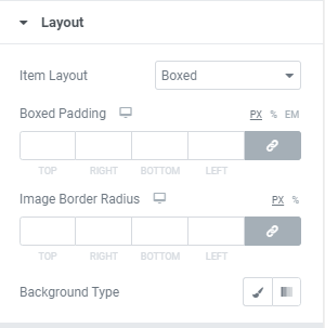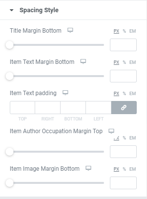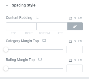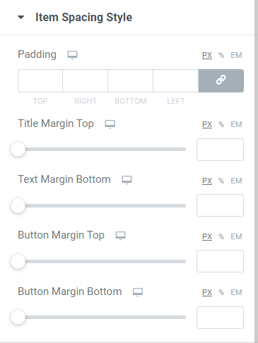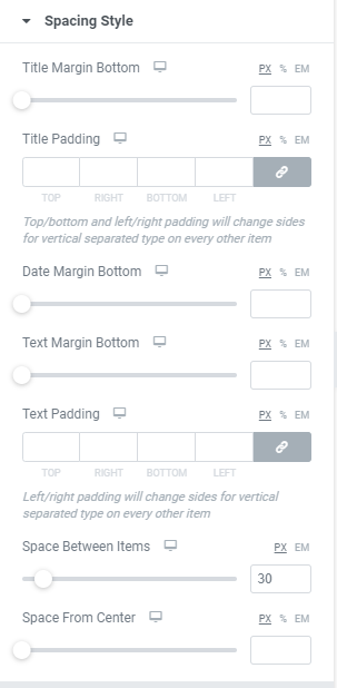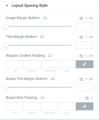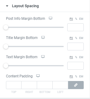 In the layout spacing sub-tab you can define the bottom margin for post info sections, titles, and text, as well as input values for the content padding.