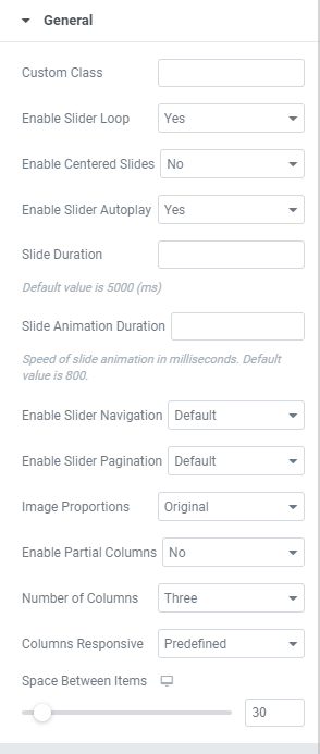 On top of that, you can choose whether you wish to display slider navigation arrows & pagination bullets, configure slider image proportions, choose a number of columns you wish the carousel slider to contain, choose a predefined number of columns for different screen sizes or input custom values for separate responsive stages, and choose a size for the space between the items in your slider.