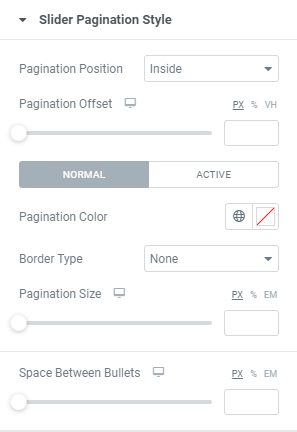 Here you can choose where you wish to position the pagination bullets relative to the slider, alter the offset for pagination, and apply different stylizations for the pagination in its normal (idle) and active states.