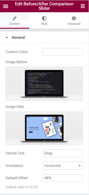 Here you can add an image you wish to display for the before stage, and an image for the after stage. You can also input the text that will be displayed on the draggable slider handle, pick an orientation style for the slider, and input a value for the default image offset.