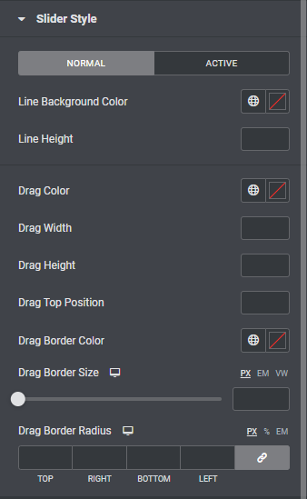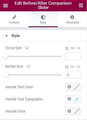 Here you have the option to set the size of the circle displayed on the slider handle, adjust borders, handle text color and typography, and the color of the draggable slider handle itself.