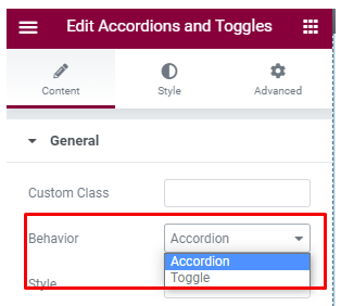 Right off the bat, you have the Behavior dropdown where you can opt for using the Accordion or Toggle widget layout. Accordion behavior type enables opening only one section of the element at a time – once a section is clicked on to be expanded, the previously opened one will close. Toggle behavior type allows for multiple sections to be expanded simultaneously.