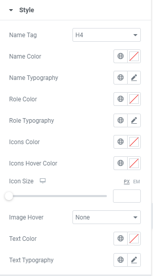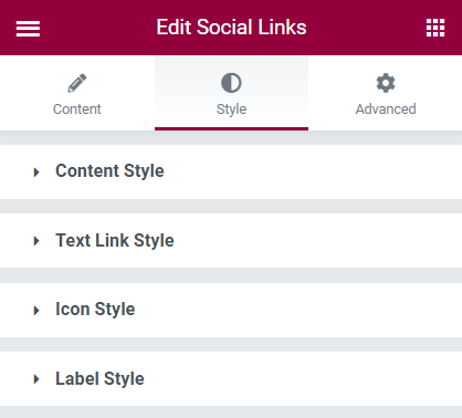 After you have finished with the basic set up of your social links, you can move on to styling the element. To access these settings, simply click on the tab titled Style, located next to the Content tab in the upper-left side of the screen. Here you'll find 4 sub-tabs for styling different aspects of the element.