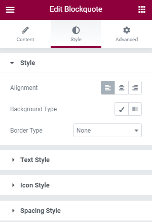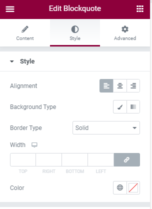 In the first section of the Style tab you can choose how you wish to align the quote text relative to the rest of the content, pick and define a background style for your blockquote, and choose whether you wish to display quote borders. In the event that you select one of five blockquote border styles, you’ll also have the option to set the border width and color.