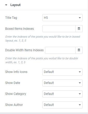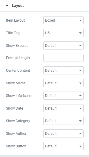 You can use the options found below to set a heading tag for item titles, choose whether you wish to display post excepts in the list and set excerpt length, pick whether you wish to center the content in the list, show media, info icons, choose if you wish to display dates for posts, categories, post authors and decide whether you wish to display the read more button.