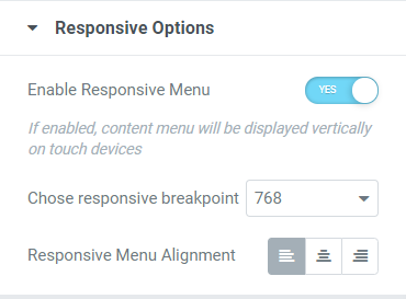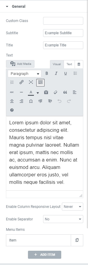 In this sub-tab you can input the basic info you wish to display in the element. You can add a subtitle, a title, and some additional textual content. You can also choose a screen resolution below which you wish to apply the predefined responsive layout for the element, and choose whether you wish to display a separator line between the items in the element.