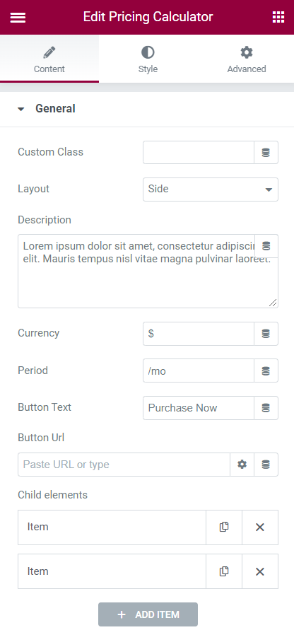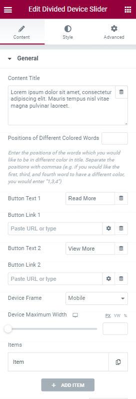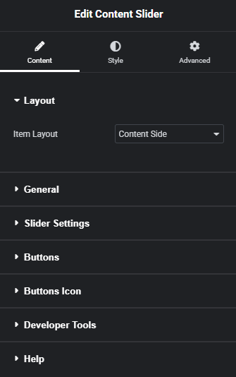Now we are going to take a look at the options available in the Content tab which contains five sub-tabs; layout, general, slider settings, button, and button icon. First off, let’s go through the settings that you can adjust in the Layout sub-tab.