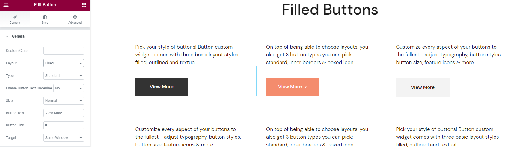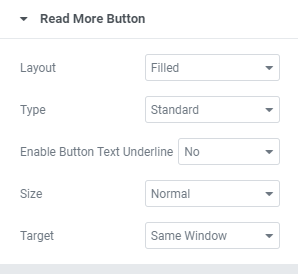 Here you can make the basic adjustments to the read more button, if you decided to display it in your list from the sub-tab Layout. First off you have the option to pick one of three button layouts: filled, outlined and textual.
