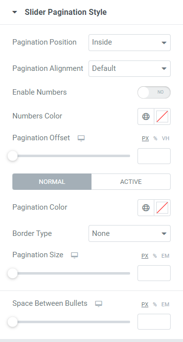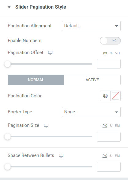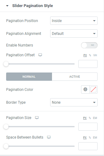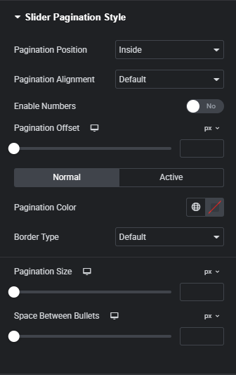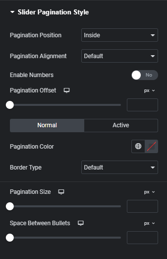 Here you can choose where you wish to position the pagination bullets relative to the slider, choose how you wish to align the pagination inside the element, enable modifiable numbers for slides, alter the offset for pagination, and apply different stylizations for the pagination in its normal (idle) and active states.