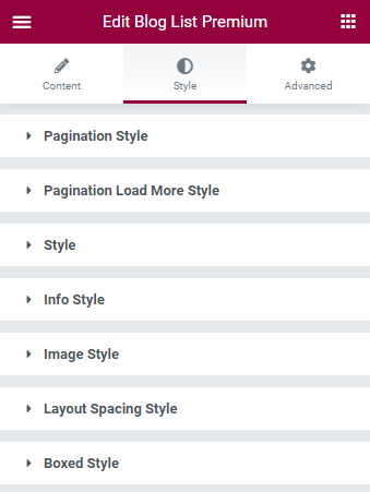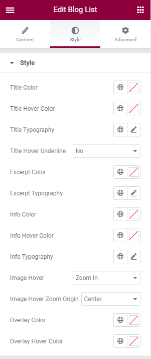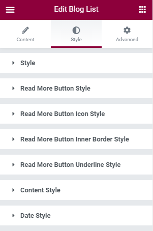 After you have finished with the basic set up of your blog list, you can move on to styling the element. To access these settings, simply click on the tab titled Style, located next to the Content tab in the upper-left side of the screen.
