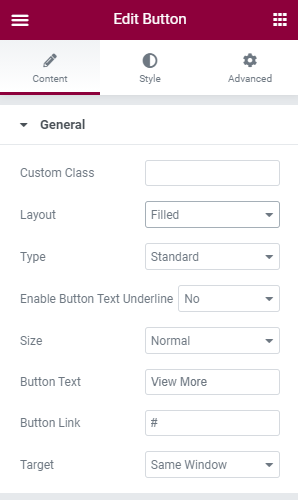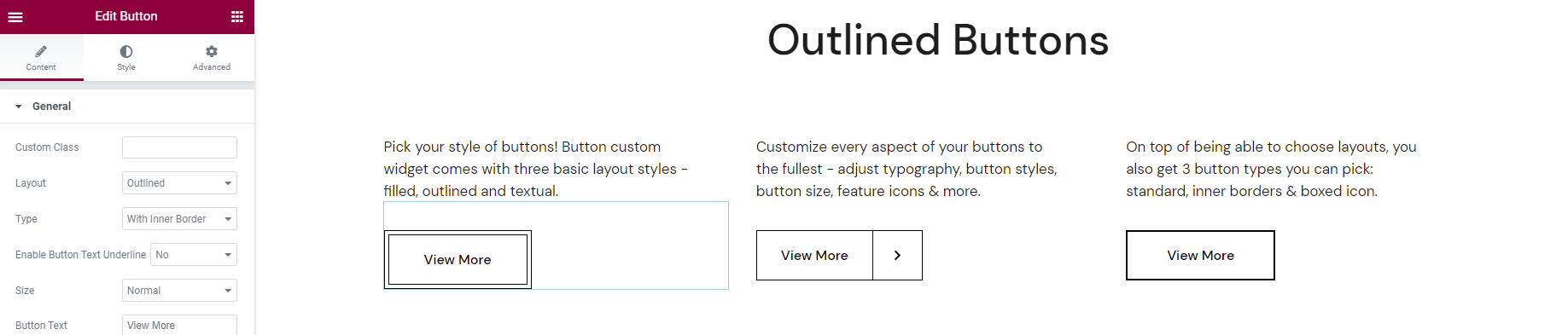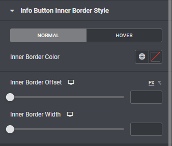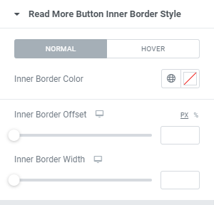 Here you can set the inner border color, offset and width, as well as pick a hover style and adjust the hover border color for your button with inner borders; please note that in order for these settings to become visible, you need to pick the With Inner Border button type from the content sub-tab Read More Button (this button type is only available for Outlined and Filled button layouts).