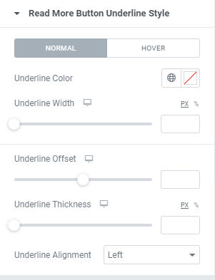 This section lets you customize the read more button underline. Please do note that in order for these settings to become visible, you need to set the Enable Button Text Underline option to ”Yes” from the content sub-tab named Read More Button.