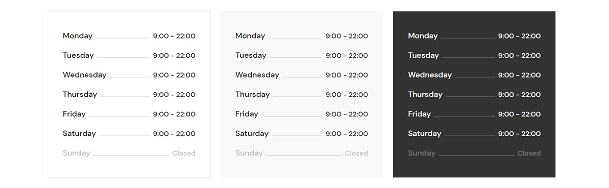 Working Hours custom widget for Elementor provides you with a great and intuitive way to display your business’ working hours in easily styled elements.