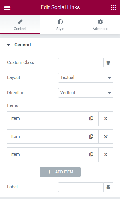 In the first sub tab you can choose a layout (you can display icons or text), and a direction for the links. You can also input a label you wish to display above the links, and add individual items or links.